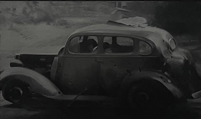 Description: Picture of Vija Celmins' painting Tulip Car #1 (1966) at the National Gallery of Art in Washington, D.C., in 2022. A photorealistic black and white oil painting of a car from the 1930s. The driver of the car is slumped over the wheel, and there are several bullet holes in the body of the car.