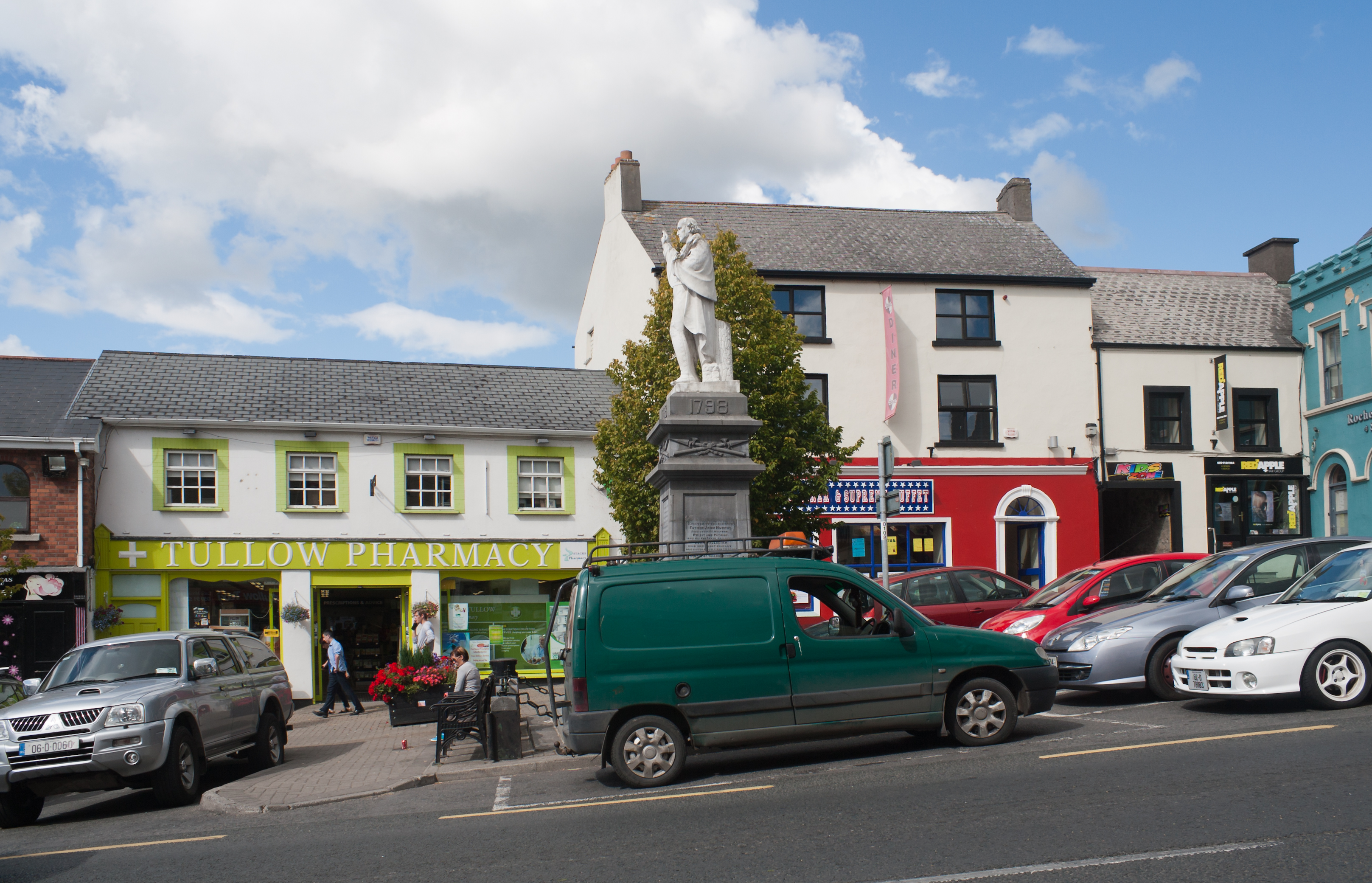 Description: Market Square in Tullow with a monument dedicated to Father John Murphy, one of the leaders of the 1798 rebellion who was caught near Tullow and executed on 2 July 1798 at the market square. The memorial was erected in 1905 by the people of Tullow.