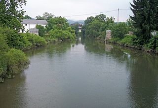 Description: The w:Tygart Valley River as viewed from a footbridge in w:Elkins, West Virginia