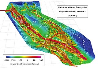 Description: 3D perspective view of California (outlined in white) and buffer zone showing the 2,606 fault sections of UCERF 3.1, with white boxes showing the San Francisco Bay (SF) and Los Angeles (LA) areas. Colors show the estimated probability of a section participating in one or more M ≥ 6.7 earthquakes in the 30 years following 2014, accounting for the current level of stress accumulated since the last earthquake. This version's scale uses percentages. Citation: WGCEP (2015-03), “UCERF3: A New Earthquake Forecast for California's Complex Fault System”, in U.S. Geological Survey[1], volume Fact Sheet 2015-3009, DOI:10.3133/fs20153009, ISSN 2327-6932 (online).