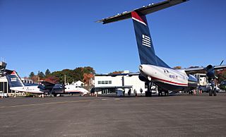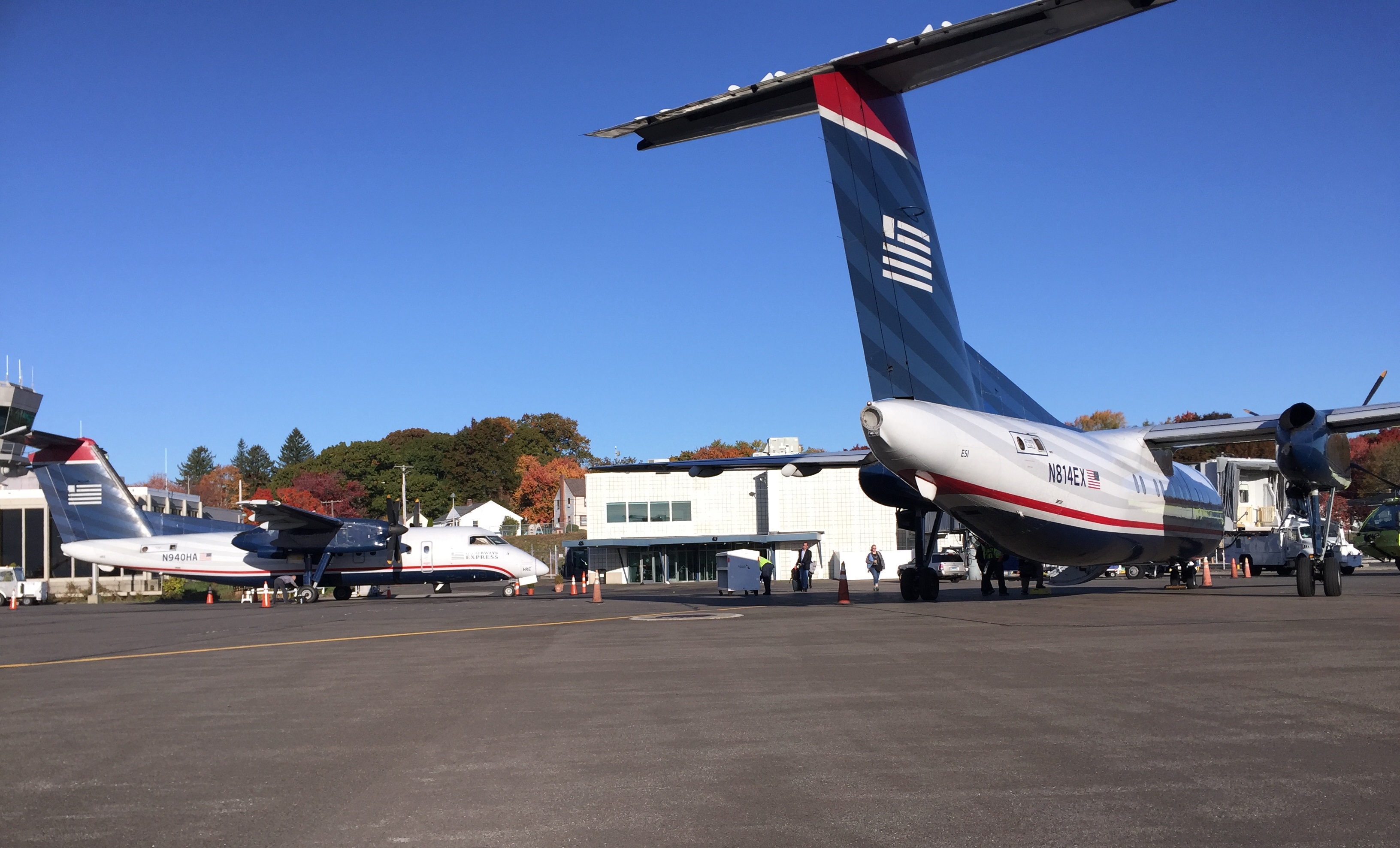 Description: Airport Administration Building (left), Passenger Terminal (right) and two US Airways Express aircraft seen from West Ramp, October 2015.