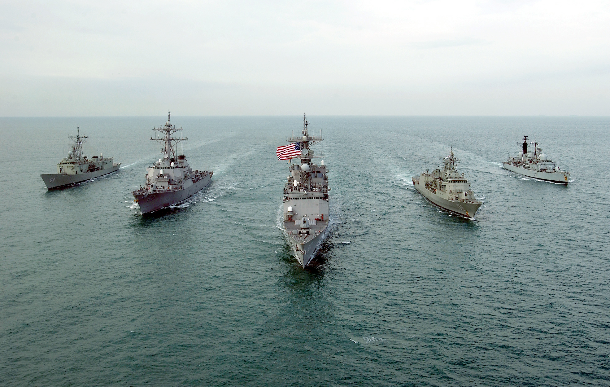 Description: Aerial photo of Security Council Coalition ships. (From left to right) Her Majesty's Australian Ship HMAS Darwin (FFG 04), the U.S. Navy guided missile destroyer USS Paul Hamilton (DDG-60), the U.S. Navy Spruance-class destroyer USS Fletcher (DD-992), Her Majesty's Australian Ship HMAS Anzac (FFH 150), and the Royal Navy Type 42 destroyer HMS Cardiff (D108). The Security Council Coalition ships are conducting Maritime Interdiction Operations (MIO) in the Central Command Area of Responsibility in support of Operation Enduring Freedom.
