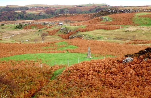 Description: Standing Stone on Ulva According to the 1:25000 map this standing stone is "fallen" - I can only assume that someone has righted it since. Photo taken from the track to Ormaig. Isle of Ulva, Inner Hebrides.