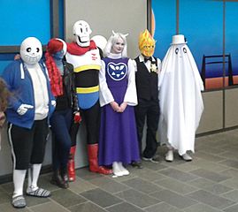 Description: Cosplyers portraying (fltr) Sans, Undyne, Papyrus, Toriel, Grillby, and Napstablook. Picture was taken at Tsunacon in Rotterdam, the Netherlands.