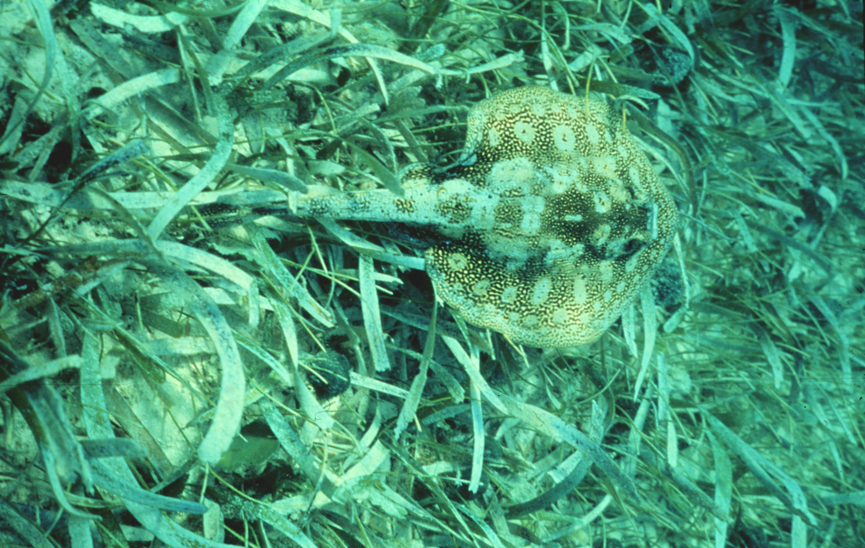 Description: Yellow stingray (Urobatis jamaicensis) among seagrass in Florida Keys National Marine Sanctuary.