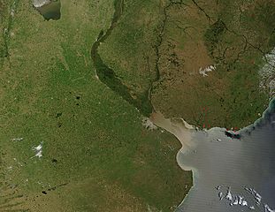 Description: Imágen satelital del Río de la Plata (los puntos rojos indican focos de incendio