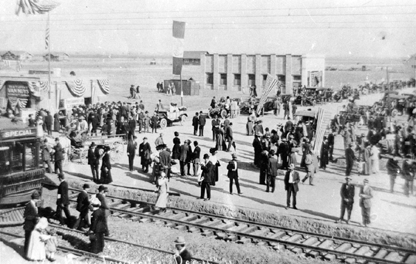 Description: Van Nuys, Calif. after 1911 when the Pacific Electric Cars, seen to the left of the photograph, were brought to the San Fernando Valley. The Van Nuys Tract office is visible behind the train. The street is decorated with patriotic bunting and flags that may indicate photograph was made during a national holiday or the opening of the Pacific Electric in Van Nuys, December 16, 1911. Black and white photograph. 8.5 x 13.5 in.