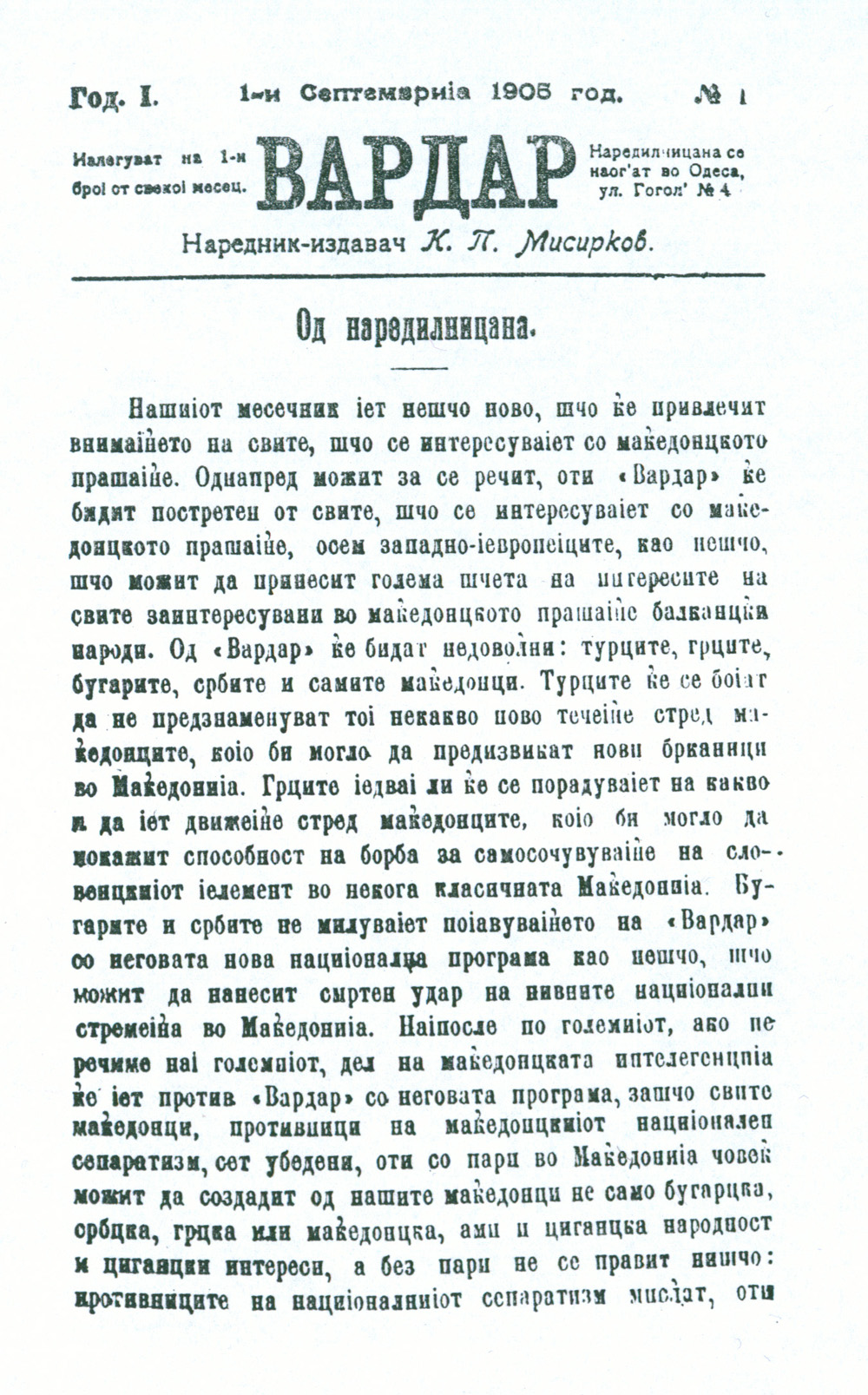 Description: The cover page of the Macedonian magazine "Vardar" published by Krste Petkov Misirkov in Odesa on 1 September 1905.