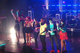 Description: Victoria Justice and the rest of the Victorious cast making a performance at Avalon Hollywood. From left to right the actor (with role played in parentheses) are: Elizabeth Gillies (as Jade West), Avan Jogia (as Beck Oliver), Ariana Grande (as Cat Valentine), Victoria Justice (as Tori Vega), Leon Thomas III (as Andre Harris), Matt Bennett (as Robbie Shapiro), Daniella Monet (as Trina Vega)