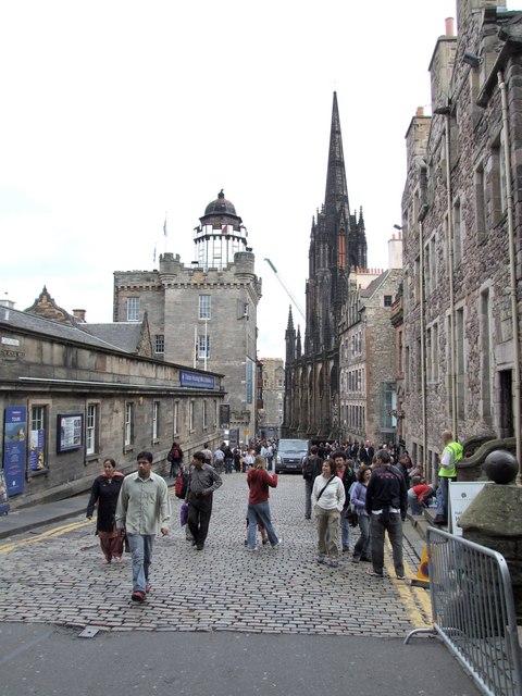Description: View from Castlehill, Edinburgh Looking from the very west of the Royal Mile. To the left is the Tartan Weaving Mill & Exhibition. Beyond is the Camera Obscura. To the right of that is Tolbooth Kirk, also known as St John's Highland Church, it has the highest steeple of all the churches in Edinburgh (73 metres, 240 feet). Located on the Lawnmarket, just down from the castle, this Gothic landmark was built in 1839/44 to house the General assembly of the Church of Scotland. After the congregation moved to Greyfriar's Kirk (where services are held in both Gaelic and English), the church lay empty for many years. It was eventually refurbished and used as the main ticket office and meeting place for the Edinburgh Festival.