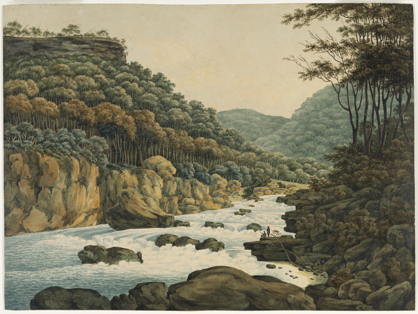 Description: 1809 water colour painting of running river in pristine landscape, NSW, Australia