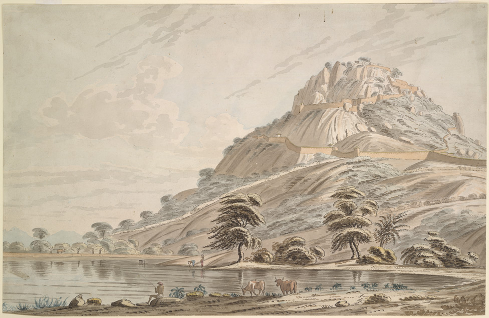 Description: Artist: Allan, Sir Alexander, 1st Baronet (1764-1820) Medium: Pen and ink on paper Date: 1791 Pen-and-ink and water-colour drawing of Anchittidrug by 1st Baronet Sir Alexander Allan (1764-1820) between 1790 and 1792 for 'Views in the Mysore Country', plate 4. This drawing was made during the third Anglo-Mysore war (1790-92), one of the most crucial battles fought by the British in their campaign to become the major power in India. In the first and second Anglo-Mysore Wars, Haidar Ali (c.1722 - 1782) and his son Tipu Sultan (1753 -1799) had fended off the British, but neither side could claim absolute success. Haidar died in the second Anglo-Mysore war. In the third war, helped by strategic alliances with other Indian rulers, the British defeated Tipu who was forced to sue for peace in the Treaty of Srirangapatna. On 18 July 1791, Anchittidrug was surrendered to the British under Lord Cornwallis, the Governor General in India, and was maintained as a post of communication until the conclusion of the war. The fort is situated at Anchetti in Tamil Nadu 35 miles from Bangalore.