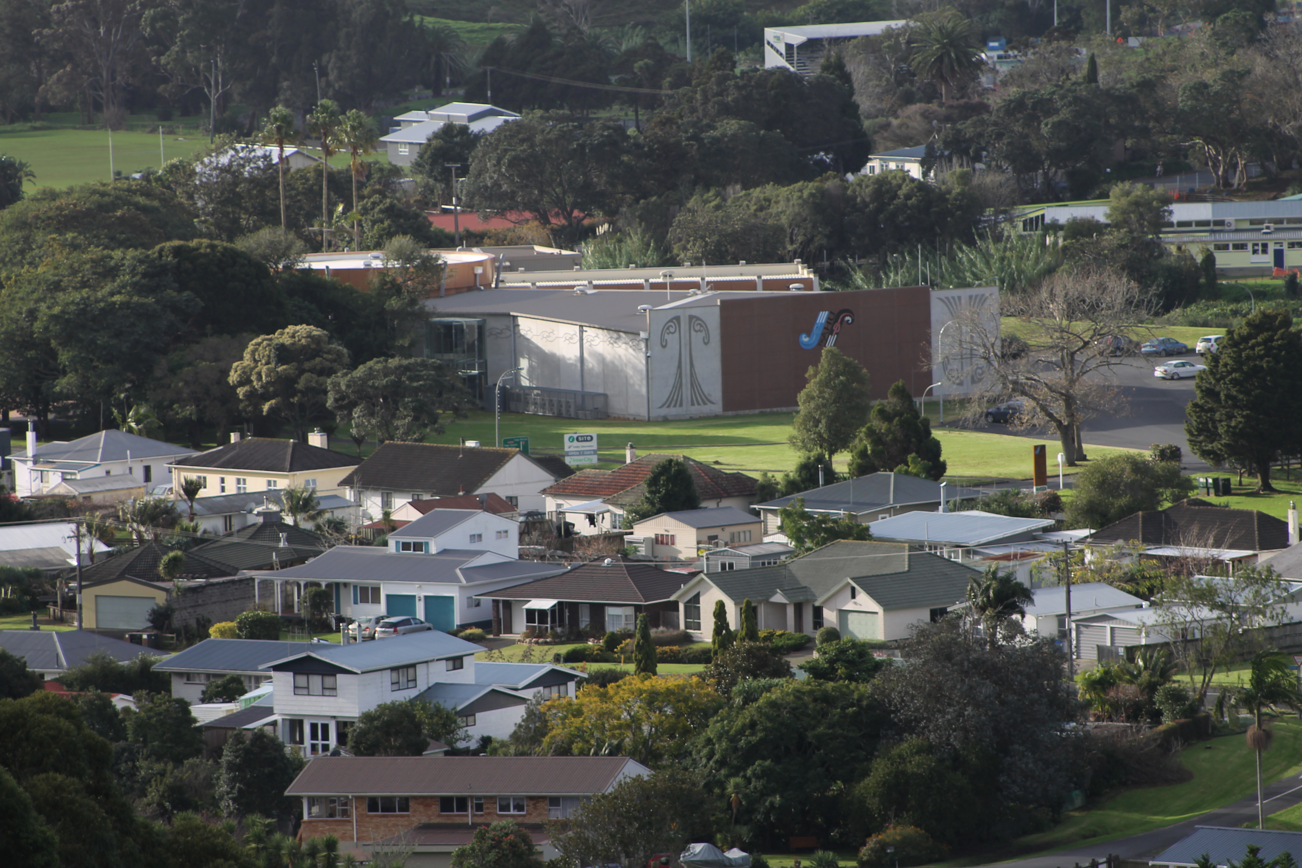 Description: A zoomed photo of the Te Ahu Center in Kaitaia taken on Okahu Road.