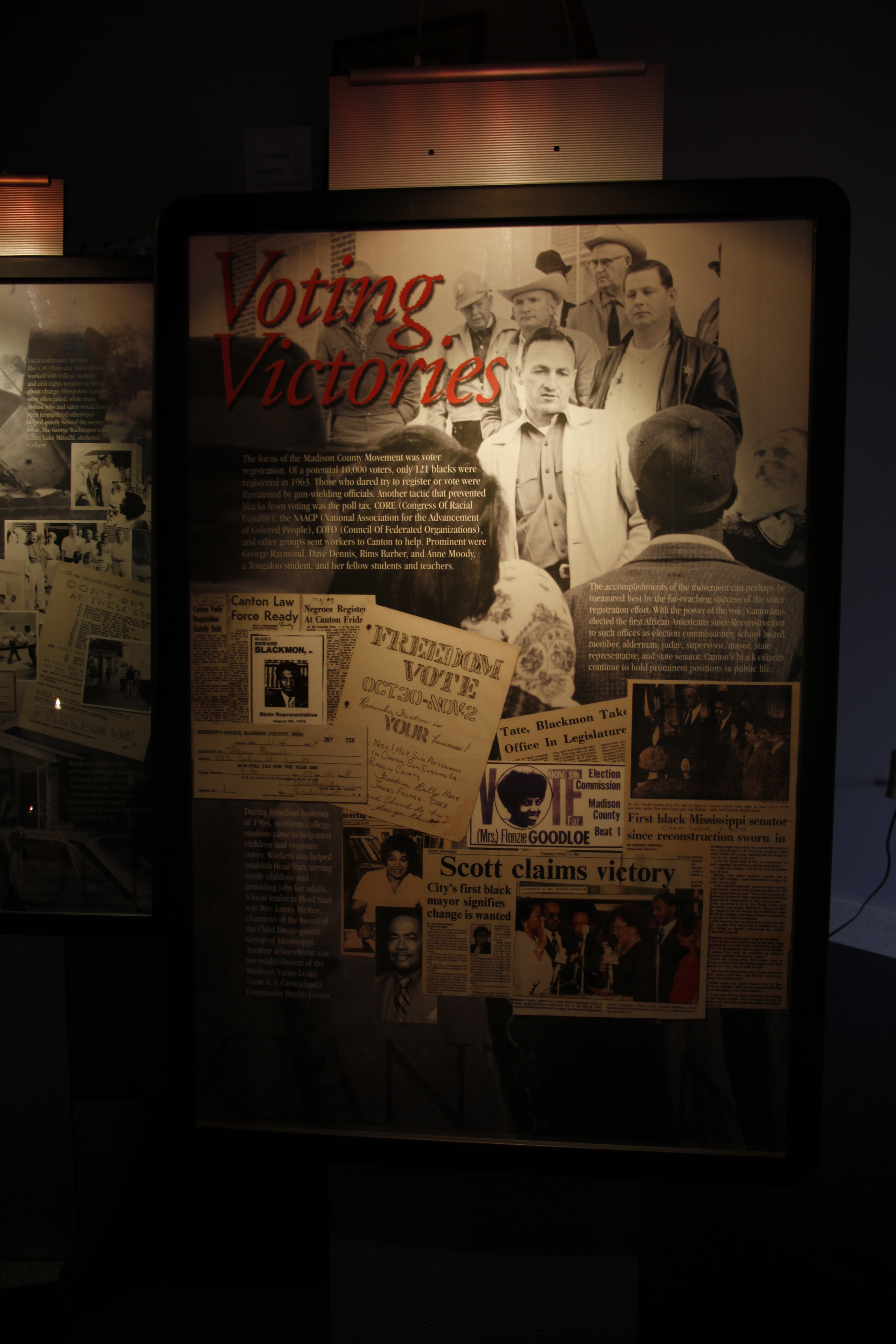 Description: Voting Victories Poster in museum reads "The focus of the Madison County Movement was voter registration. Of a potential 10,000 voters, only 121 blacks were registered in 1963. Those who dared try to register or vote were threatened by gun-wielding officials. Another tactic that prevented blacks from voting was the poll tax. CORE (Congress Of Racial Equality), the NAACP (National Association for the Advancement of Colored People), COFO (Council Of Federated Organizations), and other groups sent workers to Canton to help. Prominent were George Raymond, Dave Dennis, Rims Barber and Anne Moody, a Tougaloo student, and her fellow students and teachers."