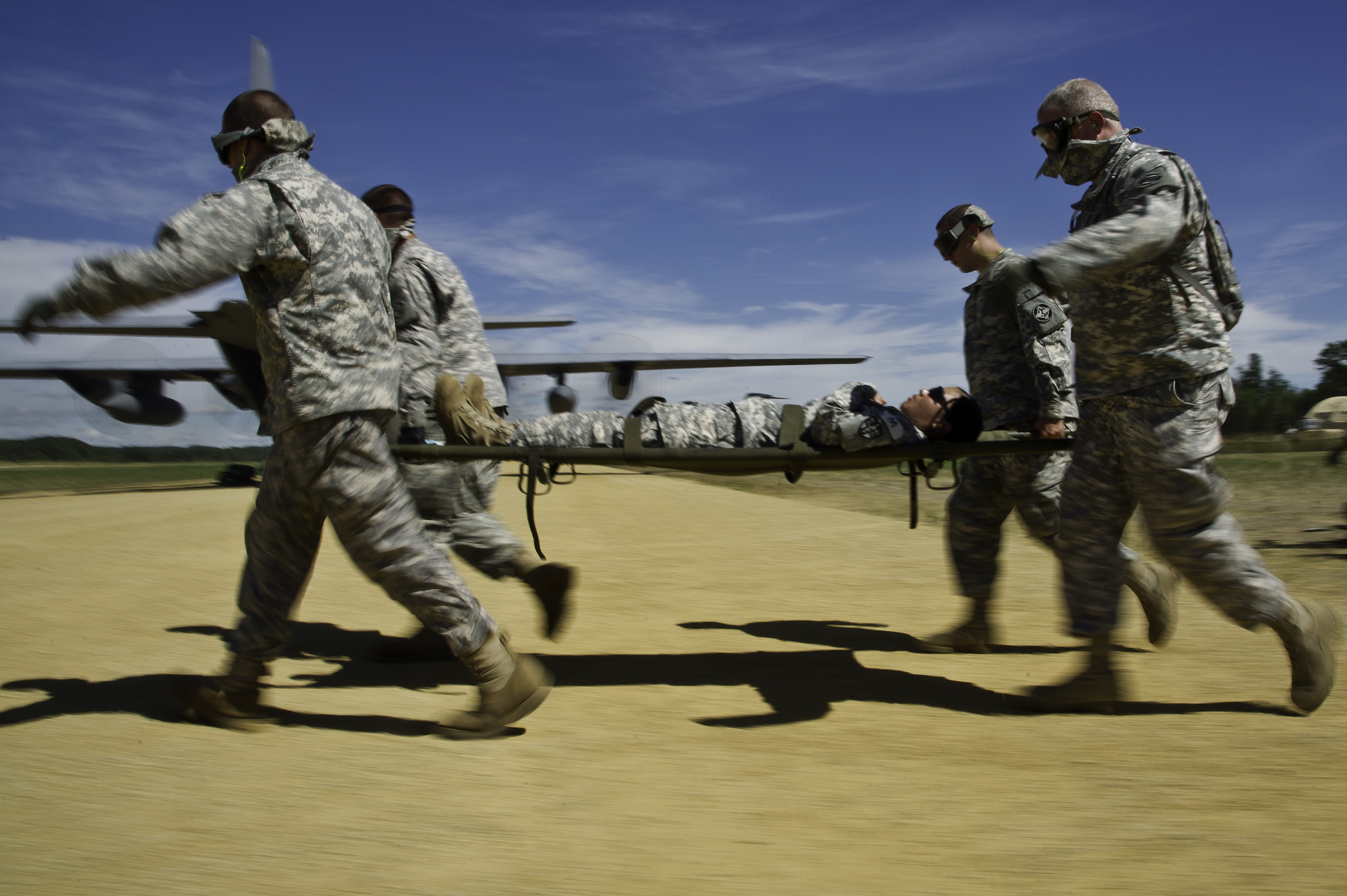 Description: U.S. soldiers carry an injured comrade using a litter on to a C-130 Hercules cargo plane during aeromedical evacuation training at Fort McCoy, Wis., July 29, 2013. The training is part of Warrior Exercise 86-13-01 (WAREX)/Exercise Global Medic, 2013. WAREX provides units an opportunity to rehearse military maneuvers and tactics. Held in conjunction with WAREX, Global Medic is an annual joint-field training exercise designed to replicate all aspects of theater combat medical support. (U.S. Air Force photo by Tech. Sgt. Efren Lopez /Released)
