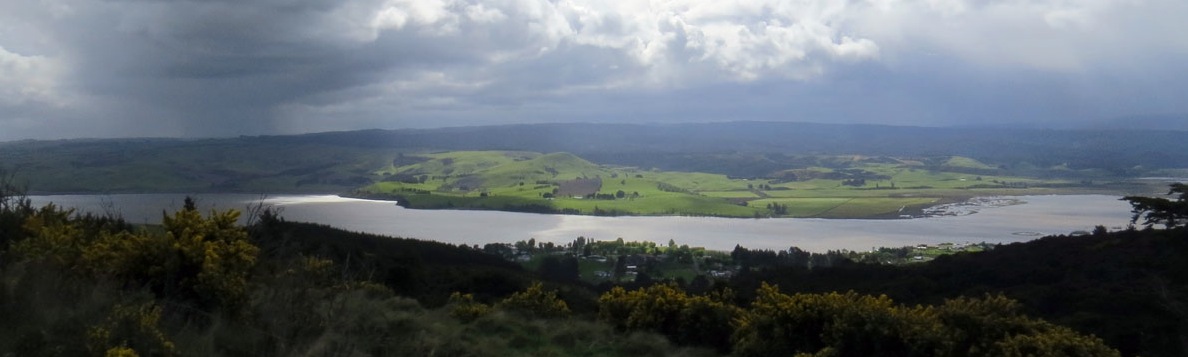 Description: Panorama of Lake Waihola, New Zealand, with the settlement of Waihola visible centre.