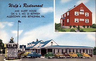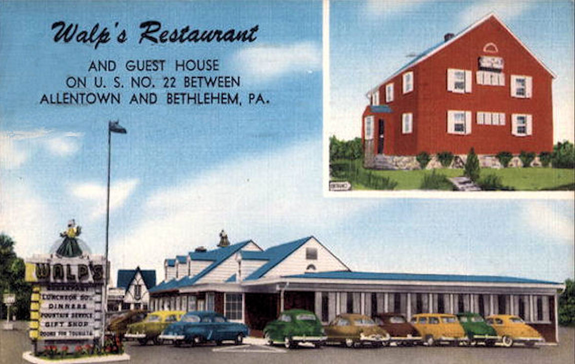 Description: Postcard of Walp's Restaurant (1940s) in Allentown, Pennsylvania. Built before World War II on Tilghman Street when it was still designated as US 22. The restaurant was family-owned and welcomed thousands of families celebrating milestone birthdays and anniversaries and toasting newlyweds at wedding receptions, high school reunions and other occasions. Many local and out-of-town celebrities dined at the restaurants. Purchased by Rite-Aid and closed day after Thanksgiving in 1998. Building torn down about 2002 and was replaced by super-pumper convenience store.