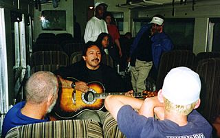 Description: Wapistan (Lawrence Martin) playing on guitar and singing in Polar Bear Express on the way from Moosonee to Cochrane, Ontario, Canada.