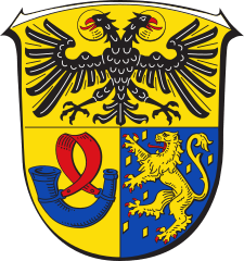 Description: Das Wappen des Lahn-Dill-Kreises wurde am 4. August 1980 verliehen und ist aus zwei Teilen der Wappen der früher selbständigen Kreise Wetzlar und Dillkreis zusammengesetzt worden. Im oberen Teil symbolisiert der Doppeladler die ehemals Freie Reichsstadt Wetzlar; im unteren Teil stehen das Jagdhorn und der Löwe für das frühere Fürstentum Nassau. [1]