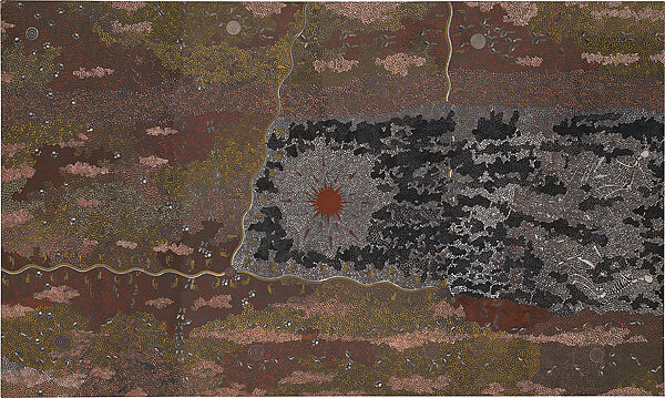 Description: Warlugulong (1977), a painting by Clifford Possum Tjapaltjarri.