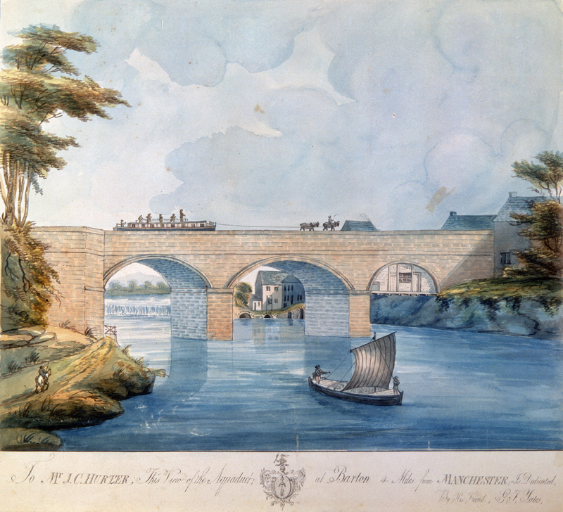 Description: Watercolour, pen and ink image of James Brindley's Barton Aqueduct circa 1793 carrying the Bridgewater Canal over the River Irwell. Horsedrawn barge moving across the aqueduct, small river barge beneath