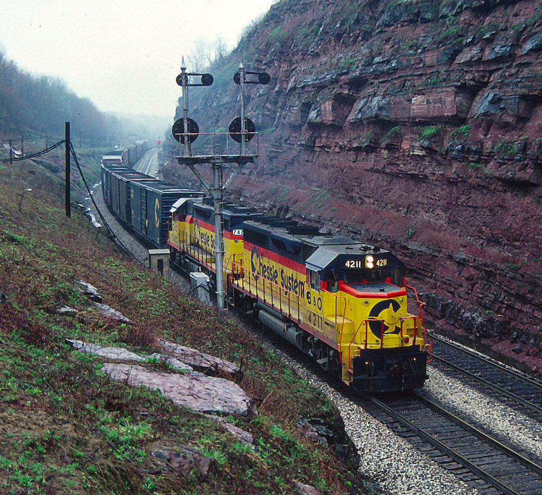 Description: Eastbound about to enter the tunnel at the summit of Sand Patch Grade, Pennsylvania. April 1987. Scan from 35mm slide.