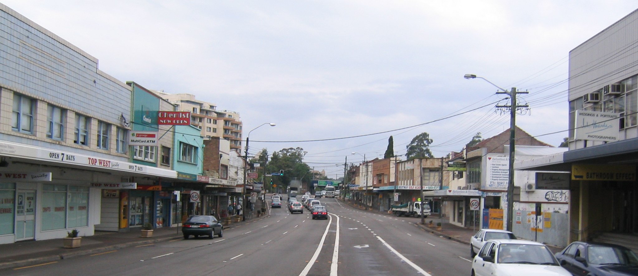 Description: Victoria road looking towards the railway bridge at West Ryde, Sydney, Australia.