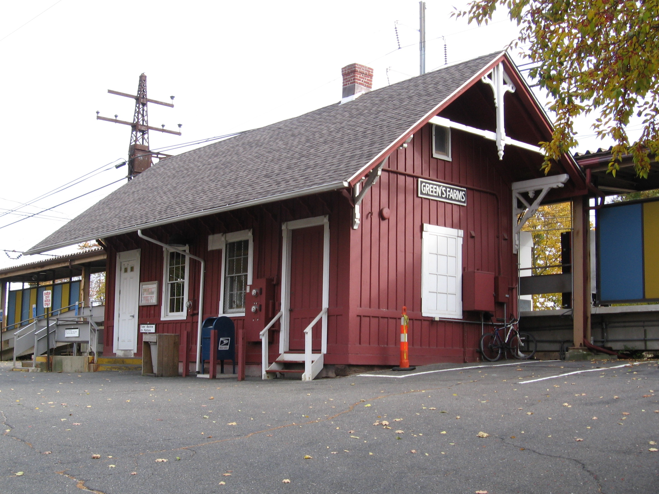 Description: Station house, seen from northwest, Green's Farms (Metro-North station) in the Greens Farms section of Westport, Connecticut. The station has an extensive parking lot, but the station house is one of the smallest on the New Haven Line of Metro-North.