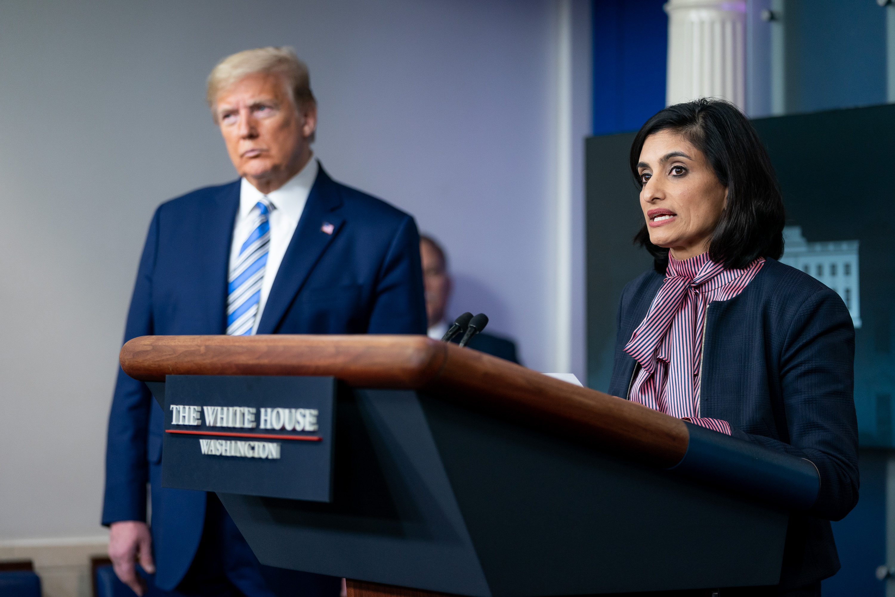 Description: Administrator for the Centers for Medicare and Medicaid Services Seema Verma, joined by President Donald J. Trump, Vice President Mike Pence and members of the White House Coronavirus Task Force, delivers remarks during a coronavirus update briefing Sunday, April 19, 2020, in the James S. Brady Press Briefing Room of the White House. (Official White House Photo by Tia Dufour)