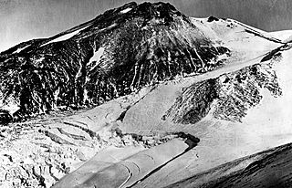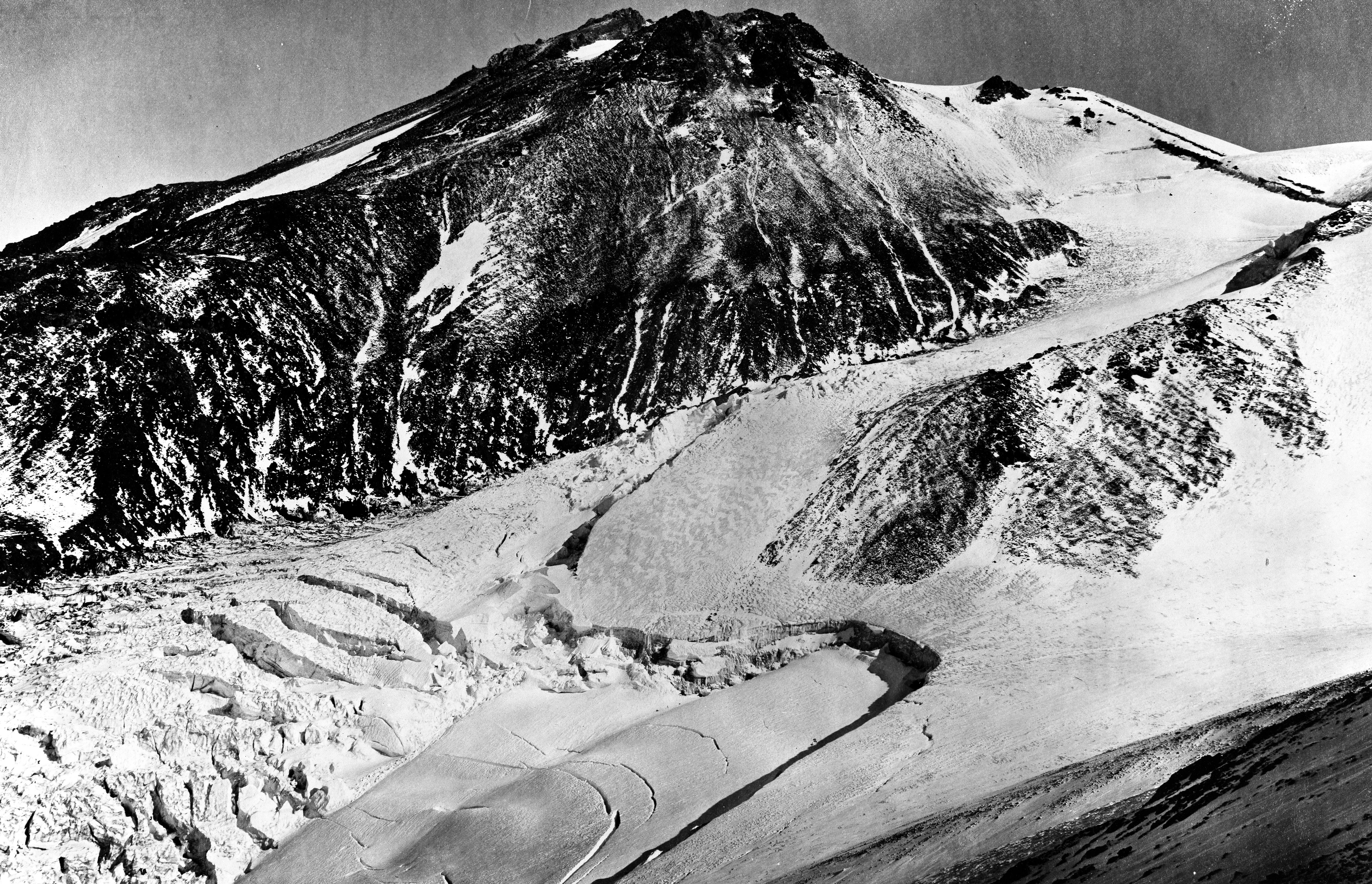 Description: The Whitney Glacier and Mt. Shasta, as seen from Shastina in 1870.