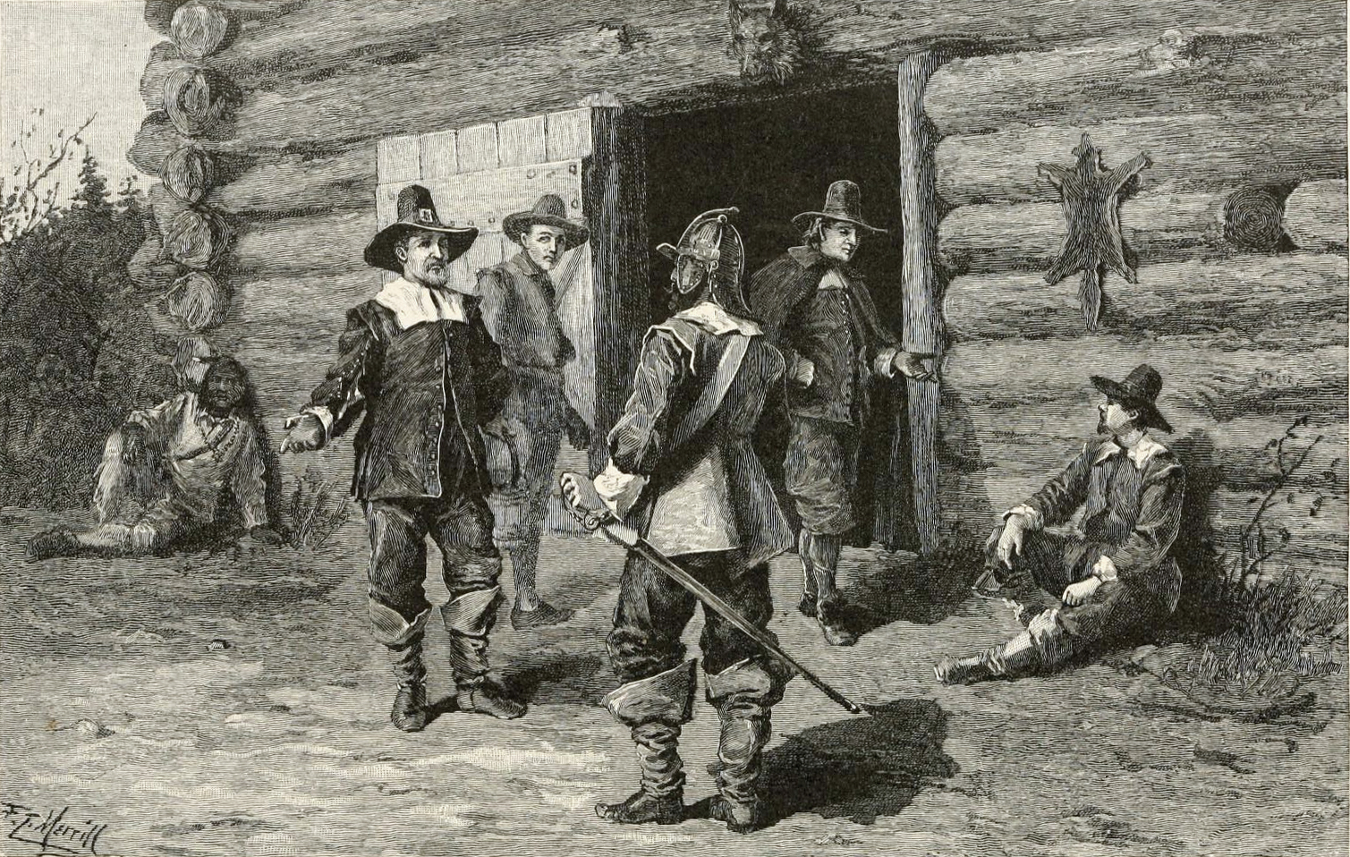 Description: A 19th century depiction of William Pynchon opposing the trade demands of Captain John Mason. |