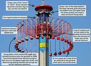 Description: A view of Kings Island's WindSeeker's ride unit stationary at the top of the tower, as seen from the queue of the Beast. Annotations are also featured on this image to describe the structure.