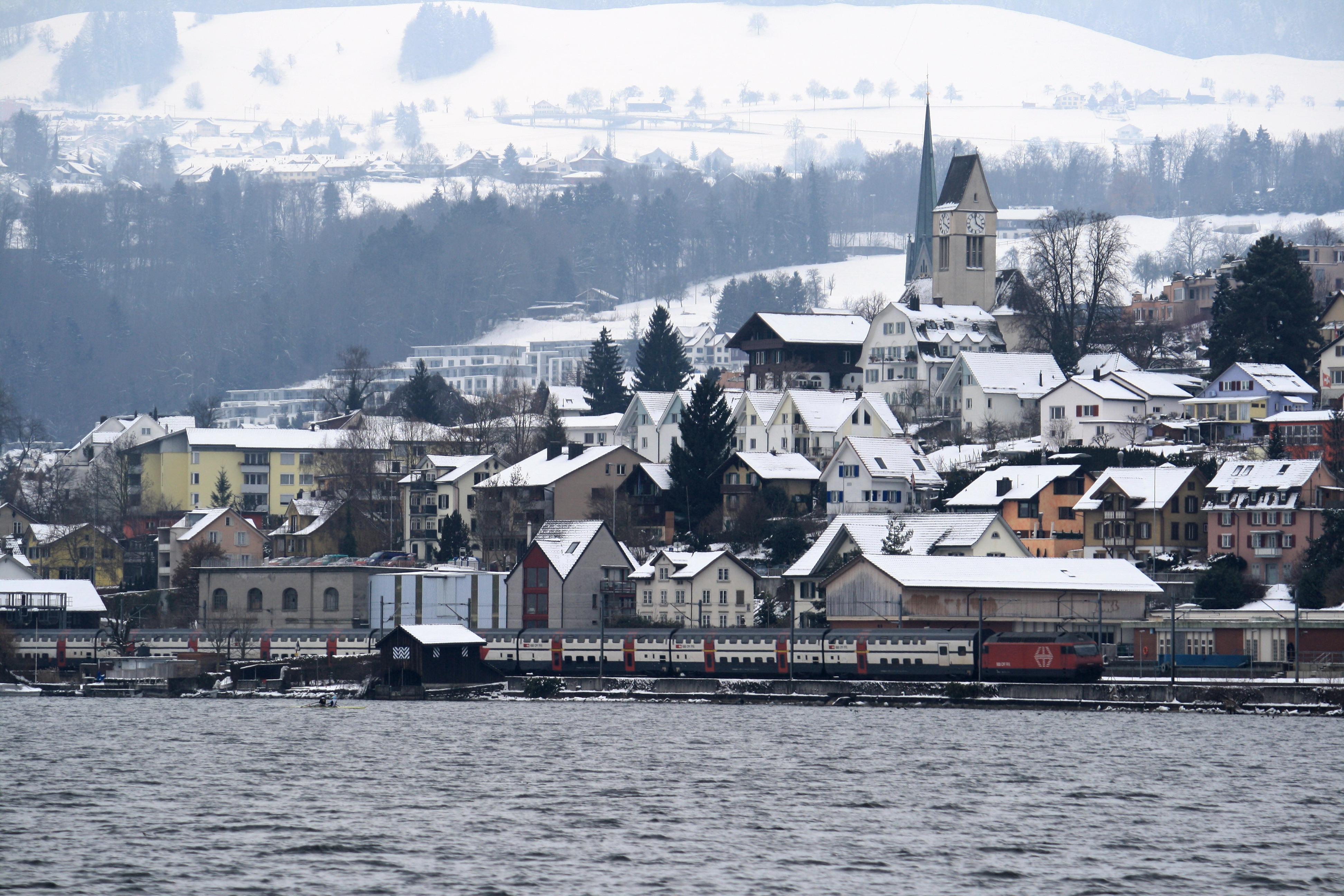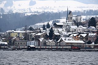 Description: Wollerau (Switzerland) as seen from the Zürichsee (Lake Zürich)