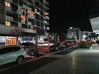 Description: Shops and high-rise apartment buildings in Wolli Creek, a suburb in southern Sydney