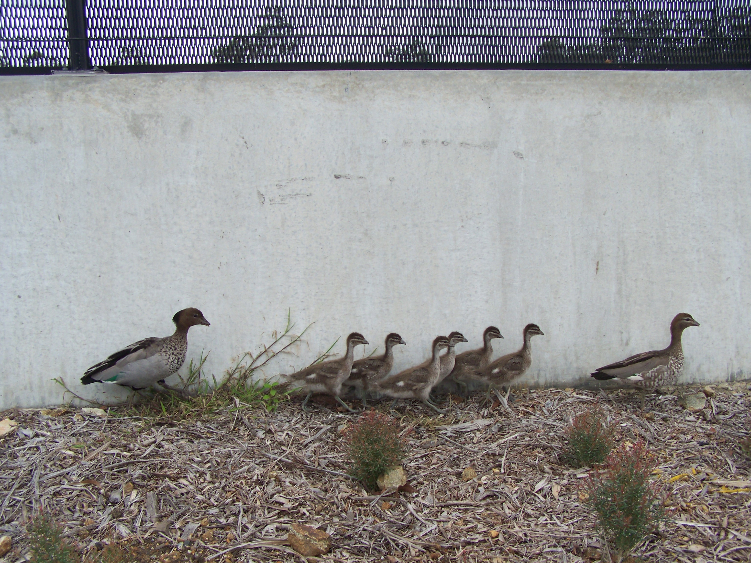 Description: a pair of mature wood ducks with their chicks, beside the motorway in Archerfield, Queensland.