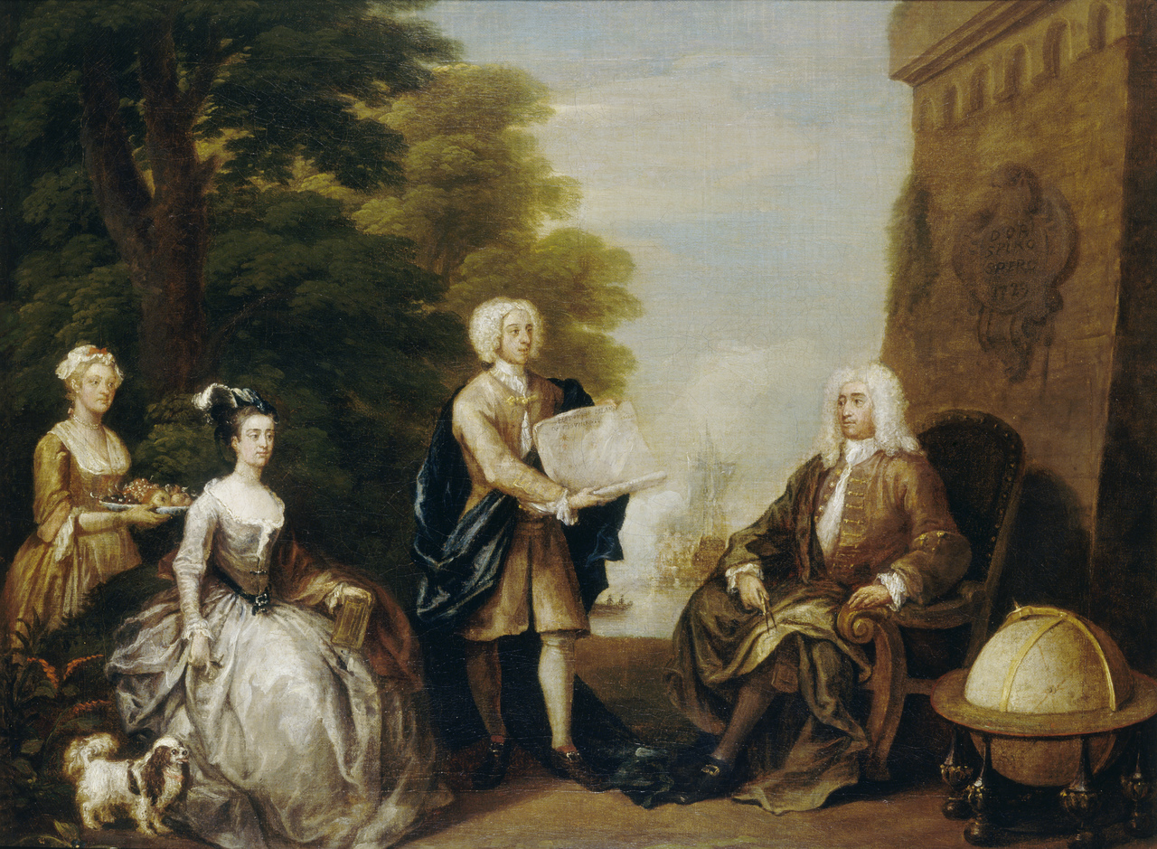 Description: Woodes Rogers and his Family An early conversation piece by Hogarth showing the family of Woodes Rogers (circa 1679-1732), a famous Bristol seaman and later Governor of the Bahamas. Rogers is seated to the right facing left, wearing a jacket, breeches and a cloak draped over his right knee. He wears a full wig, buckled shoes and holds a pair of dividers in his right hand to signify his maritime associations. On his right stands a young man, probably his son, William, who holds a map of (New) Providence Island, in the Bahamas (the site of Nassau, the capital). On the left is a girl thought to be Rogers' daughter, Sarah, holding a book on her knee. The group is framed by trees on the right and a fortification wall on the left bearing a cartouche inscribed 'Dum Spiro, Spero, 1729' ('While I live, I hope'). In the background is a depiction of a ship being saluted as it enters harbour and it is possible that this portrait was produced to celebrate Rogers's return to Nassau in 1729, and was painted shortly before his departure. On the right a globe stands in the foreground, which completes the emblematic inclusion of ship, globe, dividers and map celebrating Rogers' achievements. Hogarth also permits real life to intrude in the form of the maidservant holding a plate of tropical fruit. She stands behind the silk-clad Sarah, dressed in imitation of her mistress by wearing a string of pearls and a bow in her cap. Hogarth as satirist hovers over the composition since the servant potentially subverts the formality of the grouping by introducing a spark of wit. The dog at Sarah's feet, also wearing a bow, supports this interpretation. Woodes Rogers lived in Queen's Square, Bristol, and in 1708, during the War of the Spanish Succession, he commanded a privateer squadron of two ships (the 'Duke' and 'Duchess') that sailed from Bristol to the South Seas via the Horn. In 1709 he called at Juan Fernandez where he refitted and discovered Alexander Selkirk, who had been marooned there for four years. Selkirk was the model for Defoe's Robinson Crusoe. He subsequently raided the coast of Peru, sacking Guayaquil and being seriously wounded twice before returning round the world to England in 1711. In 1712 he published an account of his voyage, which may be the book which his daughter is shown holding here. In 1717 he obtained a 22-year lease on the Bahamas and a commission as Governor. After three years of combating Caribbean piracy there he returned to England in 1721 but went back as captain-general and governor-in-chief in 1729. He died at Nassau in 1732. His son, William Whetstone Rogers, was one of the Council of the Bahamas and later one of the three chief merchants of the Royal Africa Company. The portrait, which has an unbroken provenance since Sarah Rogers inherited it from her father in 1732, is signed 'W. Hogarth' and is dated on the architectural cartouche. Scan enlargement of BHC2973 CT Woodes Rogers and his family, William Hogarth 1729