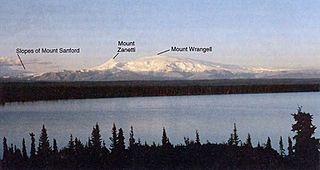 Description: Mount Wrangell and Mount Zanetti from Willow Lake, Wrangell-Saint Elias National Park and Preserve, Alaska, United States