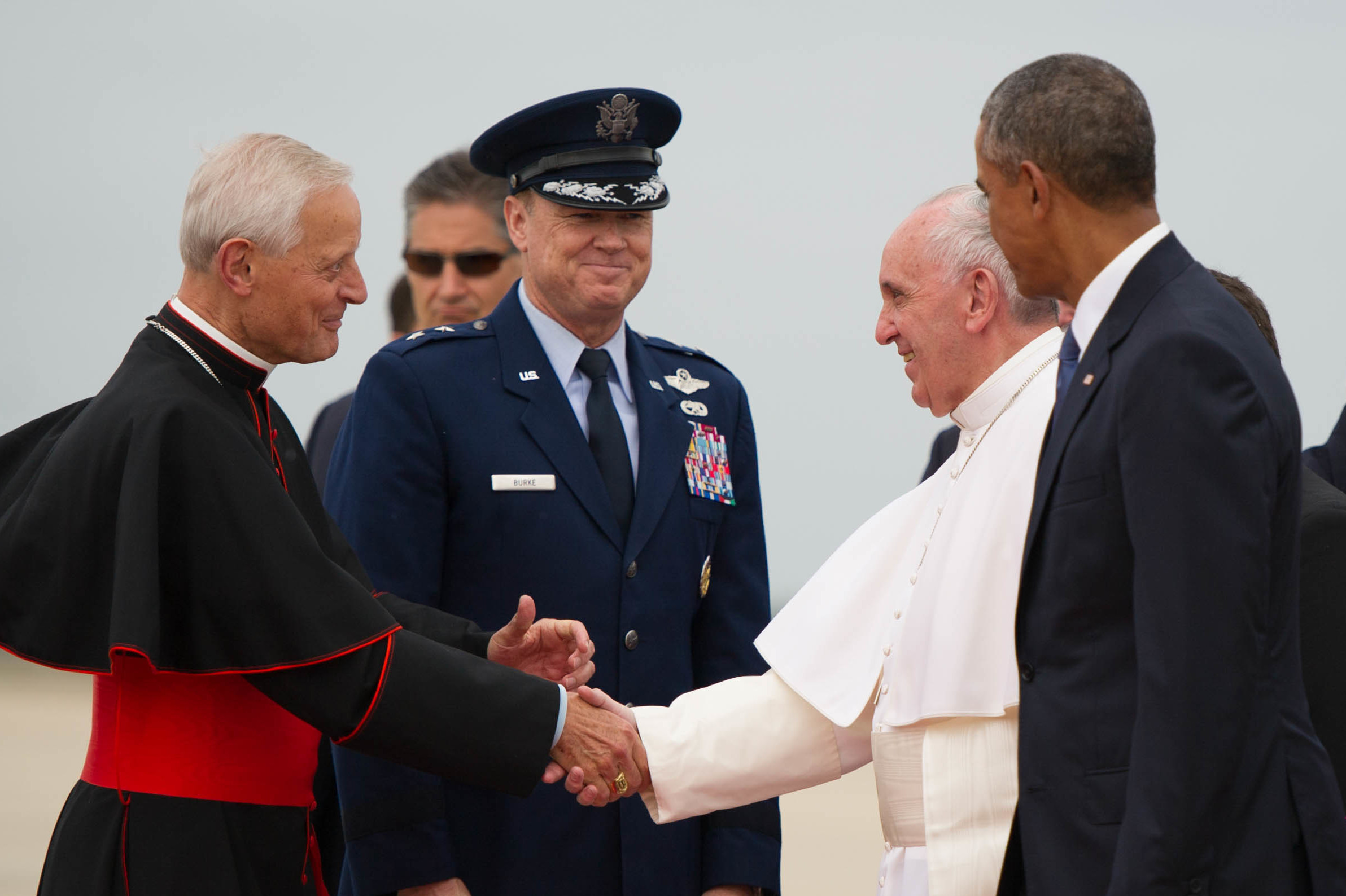 Description: Pope Francis, escorted by President Barack Obama, greets Cardinal Donald W. Wuerl, the archbishop of Washington, and Maj. Gen. Darryl Burke, the Air Force District of Washington commander, at Joint Base Andrews, Md., Sept. 22, 2015. This marked the first visit by the current pope to the United States. (U.S. Air Force photo/Tech. Sgt. Robert Cloys)