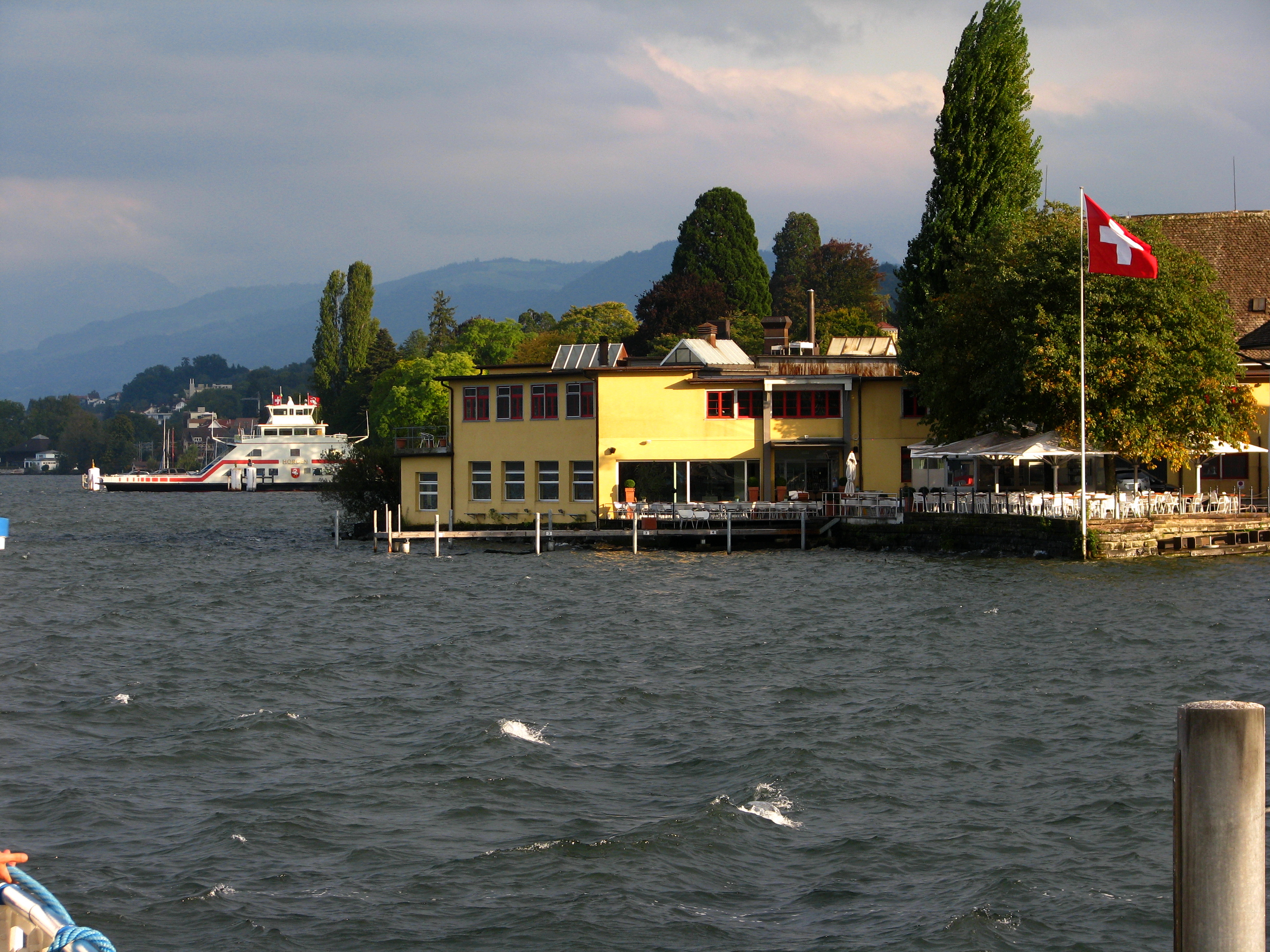 Description: Lake Zürich : Restaurant at Horgen harbour, Ferry ship «Horgen» and en:Zimmerberg in the background.