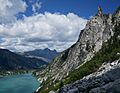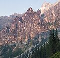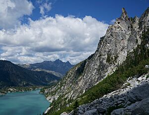 The Alpine Lakes Wilderness has very rugged land. It features jagged peaks, deep valleys carved by glaciers, and granite spires. There are also over 700 mountain lakes. Huge geological events happened millions of years ago. These events created the varied landscape and big changes in elevation. This also led to different climates across the Cascade Range.