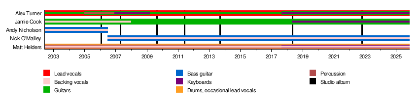At first, Alex played guitar, Matt played drums, and Andy played bass. Jamie Cook joined as a second guitarist. Alex was shy about being the lead singer, but he was good with words, so he eventually took on that role.