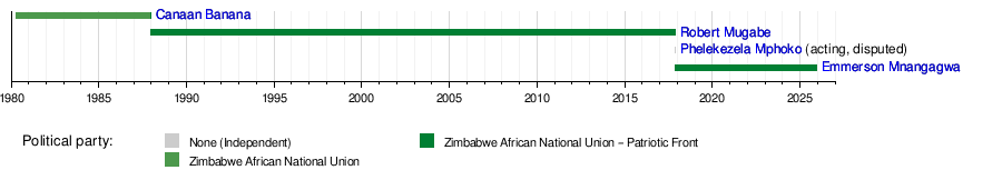 31 December 1987 | 21 November 2017 | 29 years, 325 days | ZANU–PF | 1987 (indirect) 1990 1996 2002 2008 |