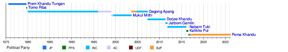 This timeline shows when each Chief Minister served and which political party they belonged to. It helps you see the history of leadership in Arunachal Pradesh at a glance.
