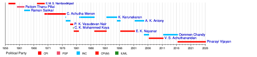 Since 1982, the Chief Minister's job has mostly been held by leaders from either the Indian National Congress or the Communist Party of India (Marxist). E. K. Nayanar has been the Chief Minister for the longest time, serving for almost 11 years in total. Pinarayi Vijayan is the current Chief Minister. His government, from the Left Democratic Front, has been in power since May 25, 2016.