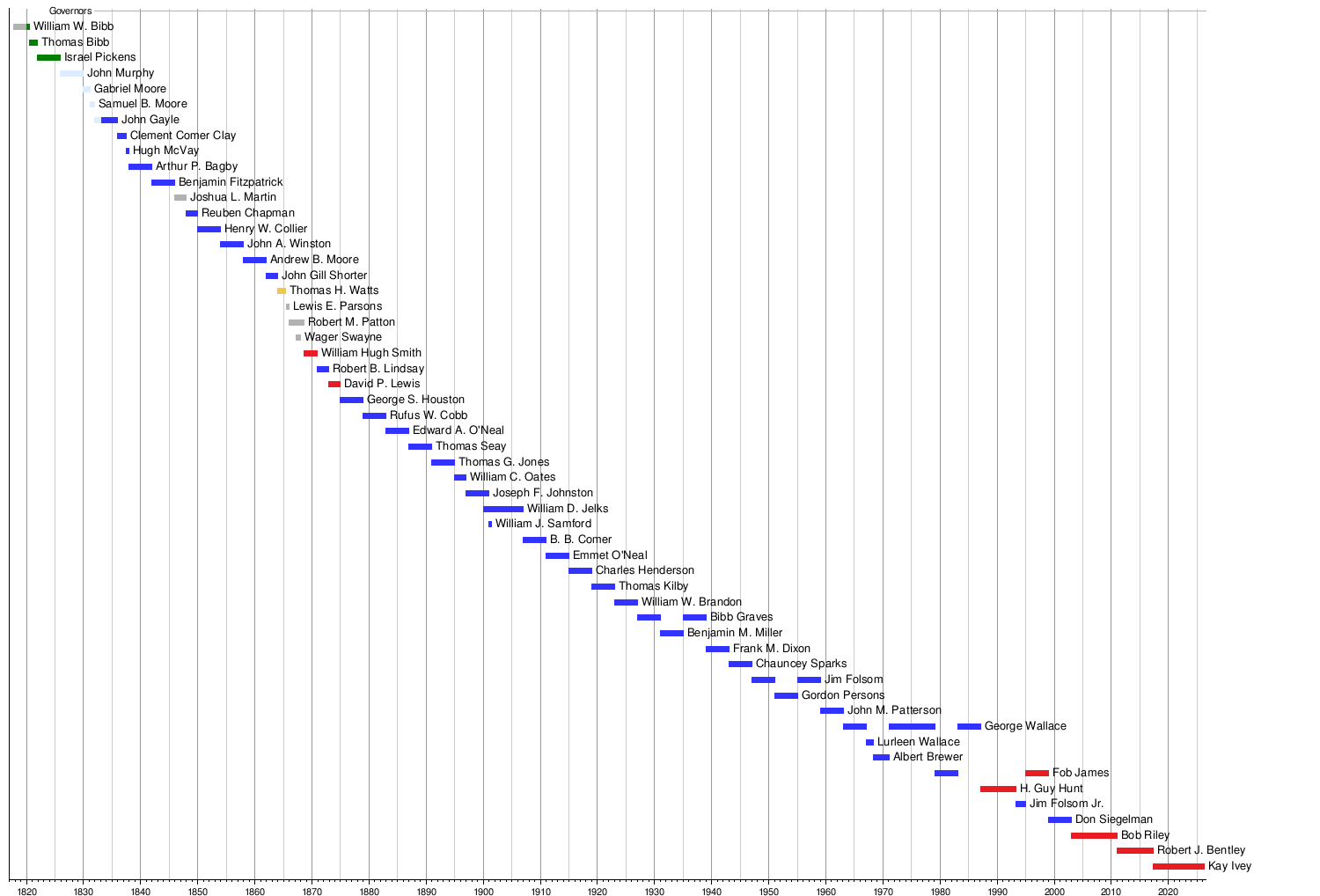Before the Civil War, Alabama mostly elected governors from the Democratic-Republican and Democratic parties. After the Reconstruction period, it took 112 years before Alabama voters chose another Republican governor. Since 2002, the state has consistently elected Republican governors.