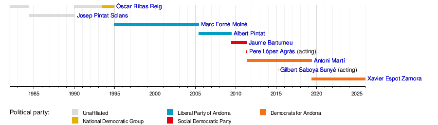 16 May 2019 | Incumbent | 6 years, 226 days | Democrats for Andorra | |