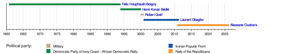 This timeline shows how long each president served. It helps you see the history of leadership in Ivory Coast at a glance.