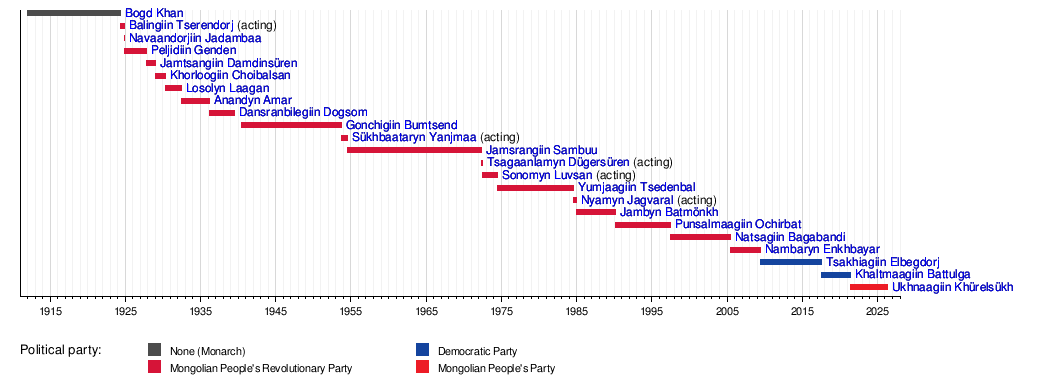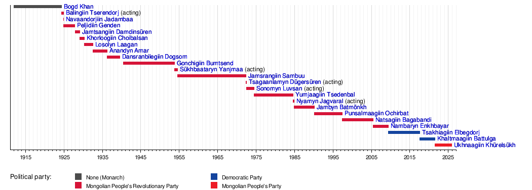 This section lists the people who have been the head of state in Mongolia since 1911. Sometimes, dates in italic mean that a person continued in their role even if the official title changed slightly.