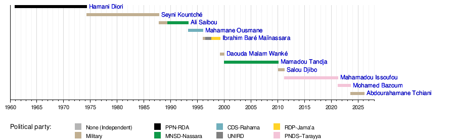 Here is a list of all the people who have been the head of state in Niger. It shows when they served and what political group they belonged to.