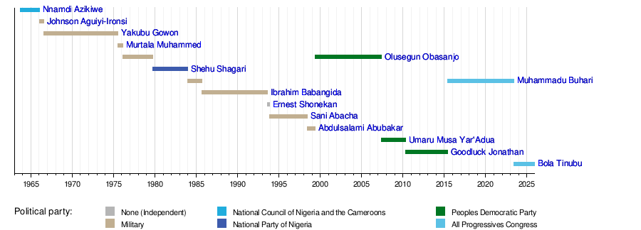 Since 1963, 14 different people have led Nigeria. The current President, Bola Tinubu, is the 16th head of state. Some leaders, like Olusegun Obasanjo and Muhammadu Buhari, served two times. They were leaders first as military officers and then later as elected civilians.